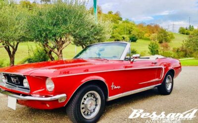 Ford Mustang Convertible 1968, moteur V8 289ci et transmission automatique. C’est un code C très désirable avec sa peinture vernie Candy Apple Red et l’intérieur Parchment, capote et C ligne assorties.